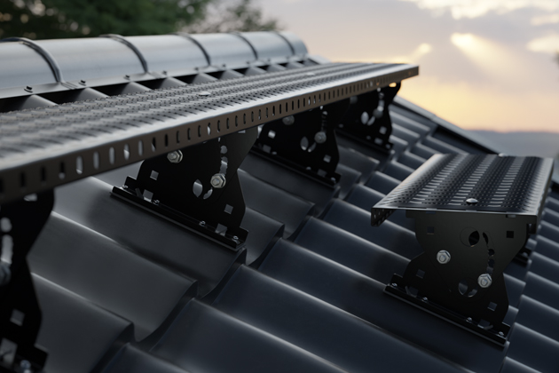- Schůdky – Jde o kovové prvky ve tvaru L. Slouží jako malé stupně, na které se dá při chůzi po střeše bezpečně došlápnout. Schůdky lze přizpůsobit střechám s různým sklonem, protože každá ze stran má jinou délku. Na střeše je pak stačí jen otočit tak, aby poskytovaly pohodlný a stabilní krok.