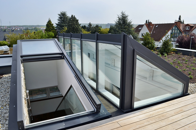 Originální řešení prosklení části střechy nad schodištěm v kombinaci s posuvným výstupem ze schodiště na plochou střechu domu, www.hladik.info