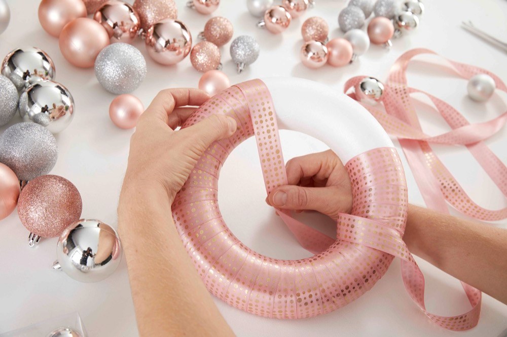 - Ještě než začneme lepit vánoční baňky, omotáme si polystyrenový korpus dárkovou stuhou. Barvu stuhy zvolíme tak, aby ladila s ostatními dekoracemi, které jsme se rozhodli použít. Bude se to hodit v případě, že po nalepení ozdob bude přece jen nějaká část korpusu vidět.